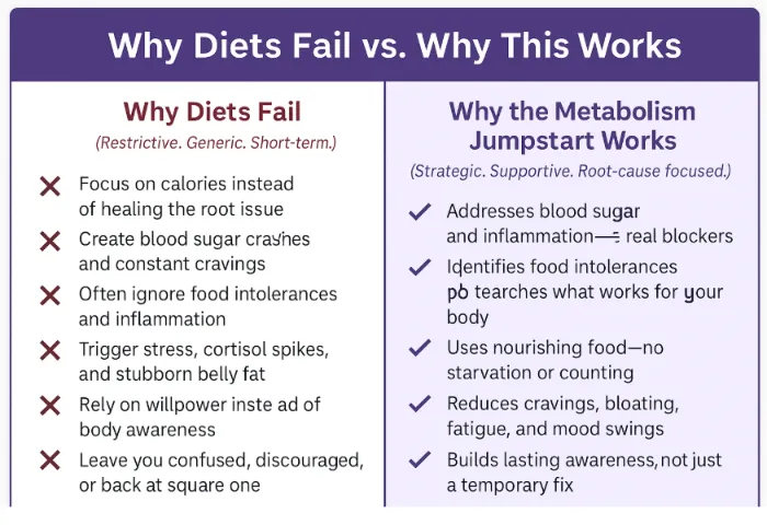 A: This isn’t a DIY experiment. It’s a step-by-step, proven reset that addresses the real reasons your metabolism is stuck—like inflammation, blood sugar swings, and food sensitivities. You get clarity, structure, and professional guidance designed specifically for women who are ready for lasting results, not quick fixes.
